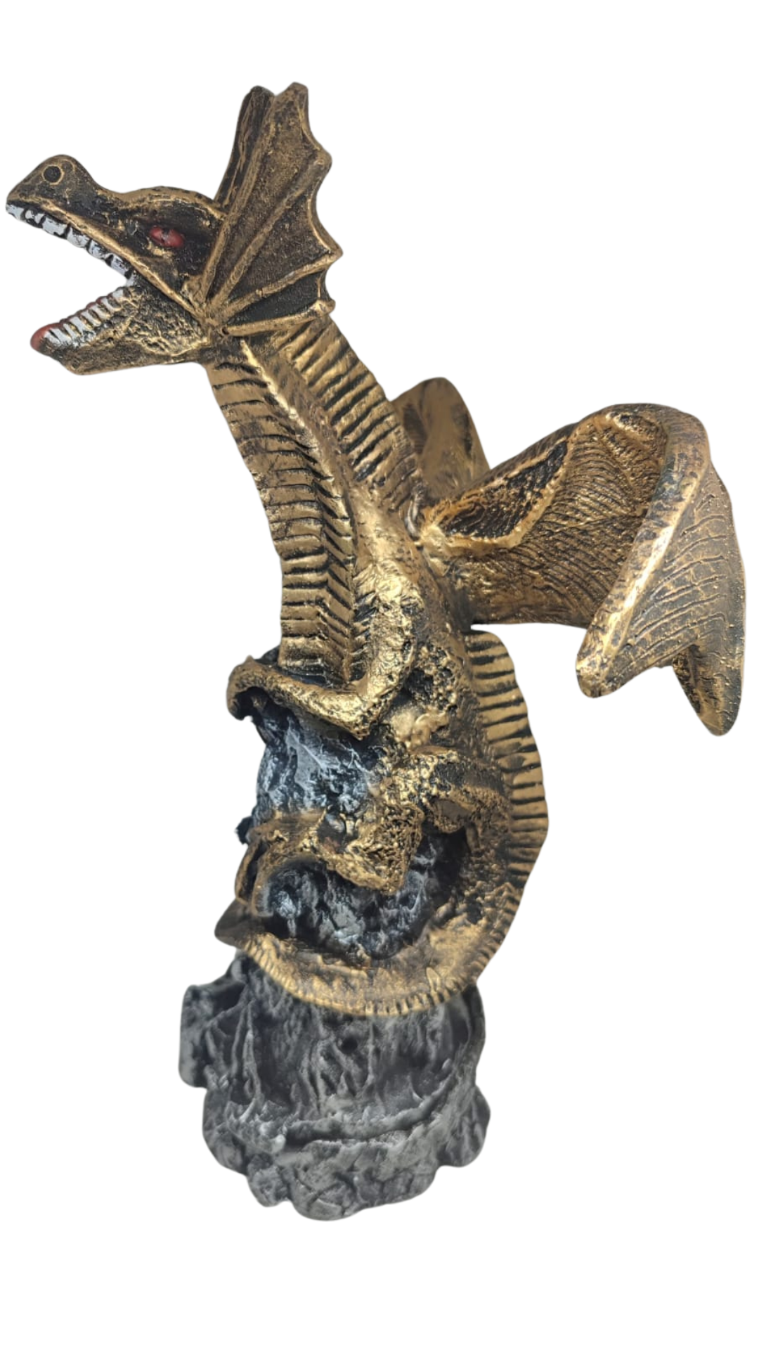 Incensário de resina no formato de dragão com asas abertas, em cima de uma pedra. Um peça impactante, que pode ser utilizada com incensos cone cascata, gerando um efeito incrível de fumaça. Ótimo para aromatizar seu ambiente e trazer a energia de força e poder do dragão!